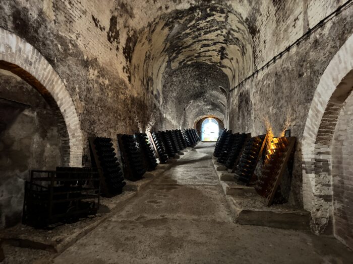 Här gick vi genom hela processen i den trånga källaren innan vi provade tre ljuvliga viner, som samtliga mina gäster gillade. Efter att ha provat deras Blanc de noirs Mémoire så öppnade Thomas en 2016 à la volée, vilket innebär att han öppnade flaskan med tång och där man inte frusit jäst-fällningen. Under stort jubel så sköt Thomas ut fällningen.